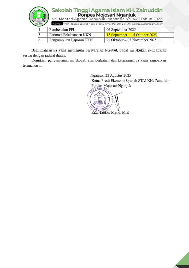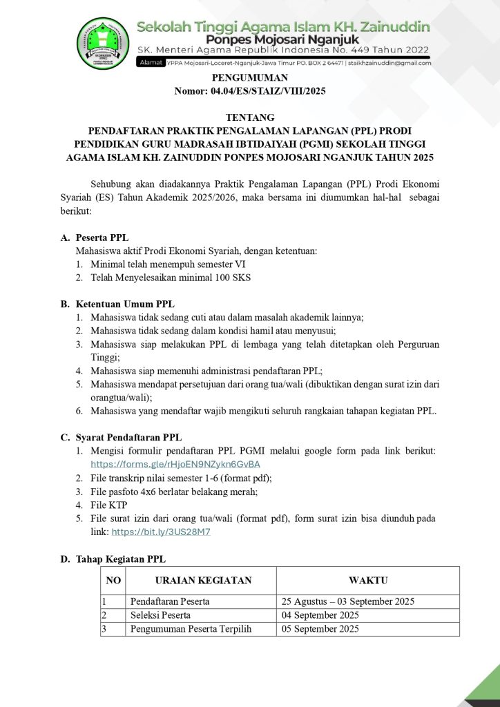 Sehubung akan diadakannya Praktik Pengalaman Lapangan (PPL) Prodi Ekonomi Syariah (ES) Tahun Akademik 2025/2026, maka bersama ini diumumkan hal-hal sebagai berikut: